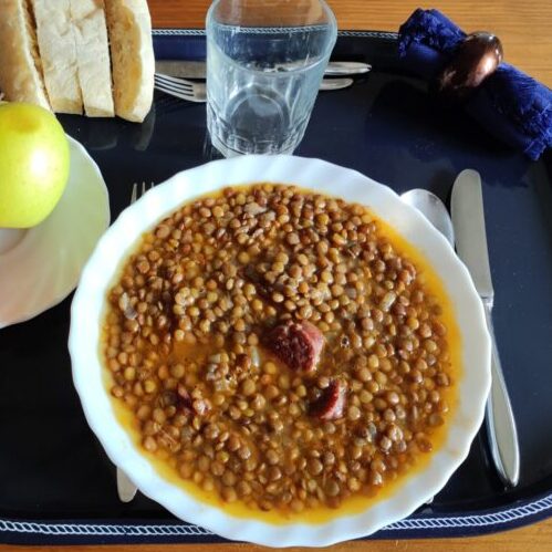Preparación para 6 comensales: Echar en una olla con agua el mísmo día de la preparación - 6 medidas de lentejas - Pellizco de sal (no es obligatorio) - Chorreón de aceite - Pimentón - Hoja de Laurel (no es obligatorio) - 1 patata (no es obligatorio) - 1 zanahoria (no es obligatorio) - Cebolla - Beicon - Chorizo. Poner al fuego rápido hasta que gire la bálbula y poner a fuego lento (al 3) durante 20 minutos. Luego apagar el fuego y dejar que termine de hacerse.